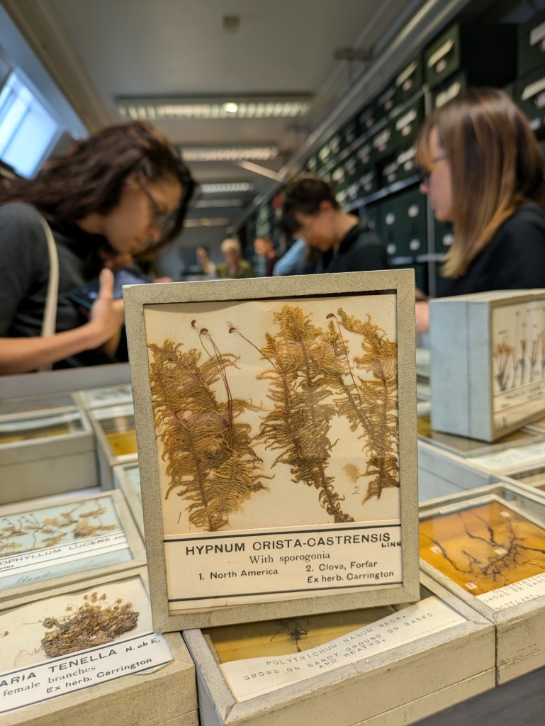 Despite the sheer variety and wealth of material Rachel had selected for us, we were left with the realisation that we had seen only a tiny fraction of the herbarium’s extensive moss-related collections. All of these things – the herbarium as a space, the specimens it contains as well as their related material cultures – can tell us a lot about previous generations’ ways of knowing moss: what they thought was important, how they sought to preserve that knowledge, what they valued and why. The aesthetic pleasure we found in the archive was mingled with our awareness of the complex histories of collecting; the ethical and political dimensions of botanical knowledge production. The visit was lively, stimulating and fun – but it also invited us to reflect on the histories, assumptions and habits that shape our own practices; it made us think carefully about the contexts in which we do our work, and its ethical implications.
