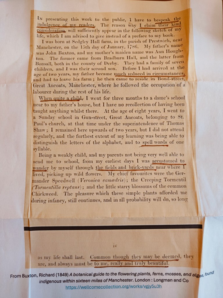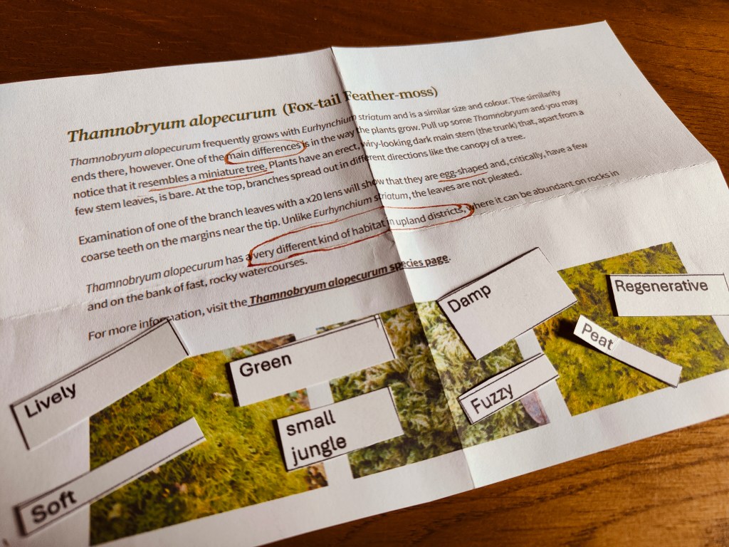Crossing out parts of sentences until only the most striking phrases remained, we then created poems out of those words, new and old voices mingling. This was a perfect rejoinder to our herbarium visit, opening up an unexpected (and unexpectedly moving) way of engaging with historical materials: a way of escaping the structures and strictures of knowing moss that previous collectors had set, of looking anew at their worlds of moss – but also of seeing moss anew with the help of their words. The boundaries between ‘scientific’ writing and poetry, research and creativity, came to seem very porous, even if each also maintained its particularity. Abbi expertly created a safe as well as experimental space for us to think and write about mosses in new ways. The session allowed us to engage generatively with the writings of nineteenth-century bryologists, and to find our own (sometimes unsuspected!) voices in and through them. Do have a look at some of the reflections and poems generously shared by members of the team!